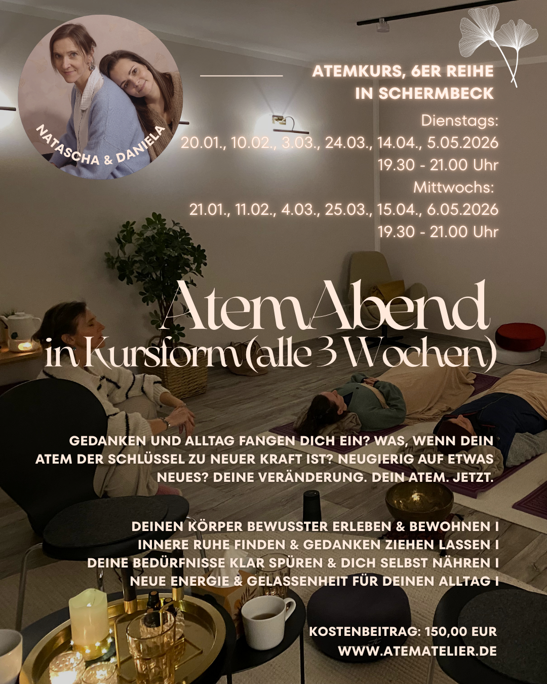 Buchungsmöglichkeiten: Einzeltermine (offene AtemAbende dienstags & mittwochs in Schermbeck, Kauf einer 5er-Karte vergünstigt möglich) oder AtemAbend in Kursform (6er Reihe).