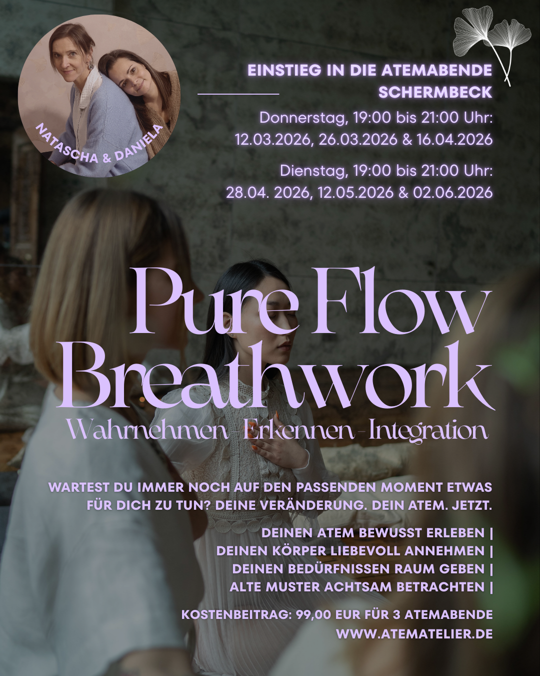 Wir, als geschulte Atemtrainerinnen, kreieren einen sicheren Raum, der Dir die Möglichkeit gibt Dich wahrzunehmen. Hier darfst Du ankommen, wie Du gerade bist.